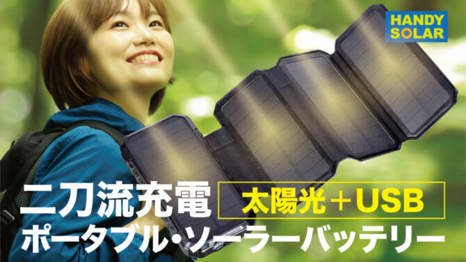 【 HANDY SOLAR(ハンディソーラー)】は、ソーラーパネルとバッテリーが一体になったモバイルチャージャー。