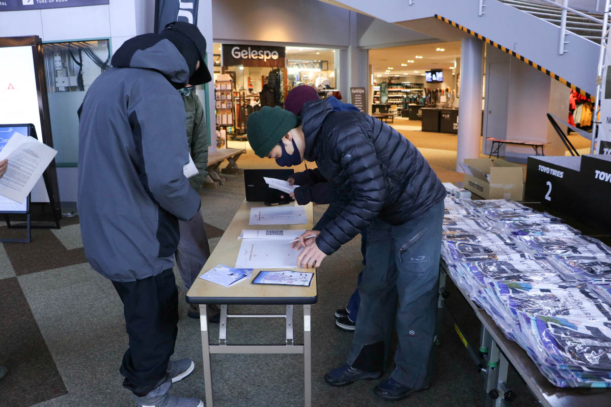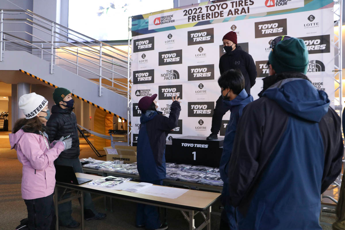 事前に事務局へエントリー手続きを済ませた選手は、大会前日にビブ(ゼッケン)の配布を受け大会参加手続きの完了となります。これまでの大会実績をもとに滑走順やビブナンバーが事前に確定しています。