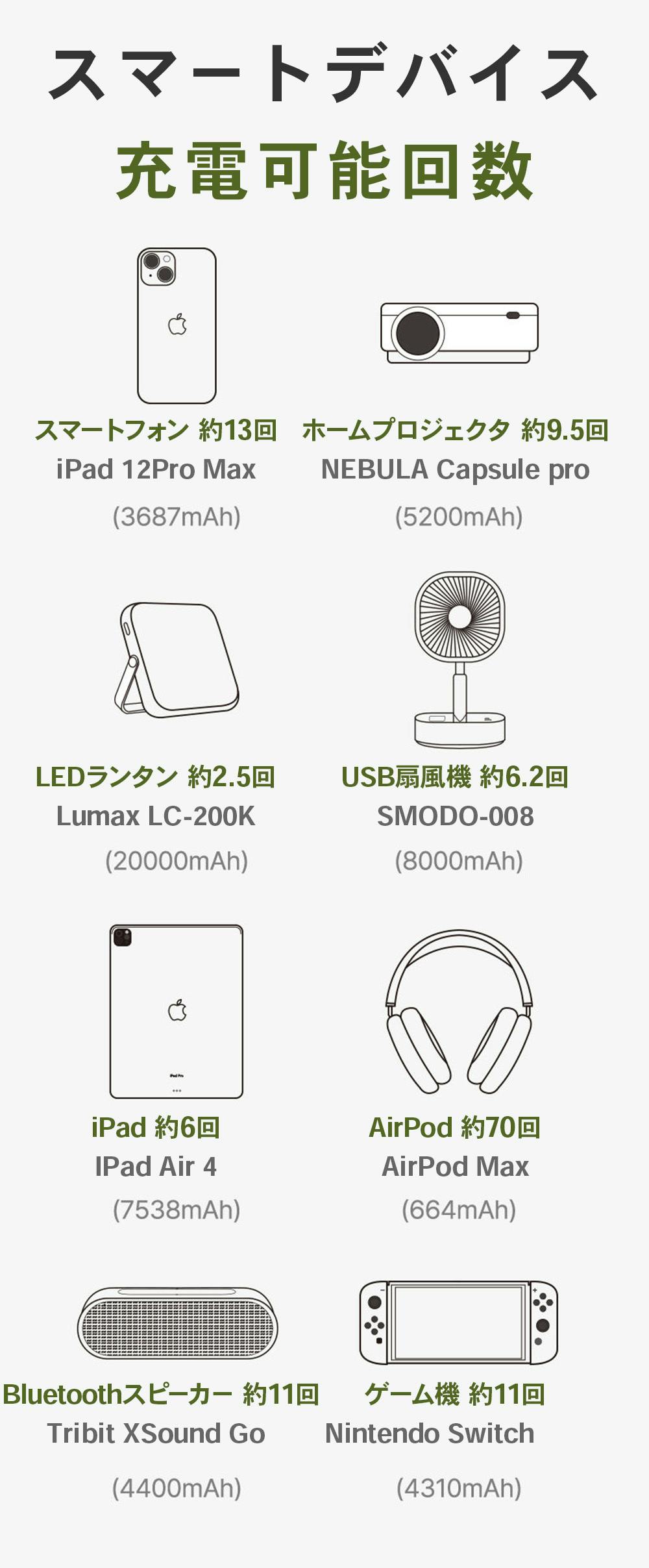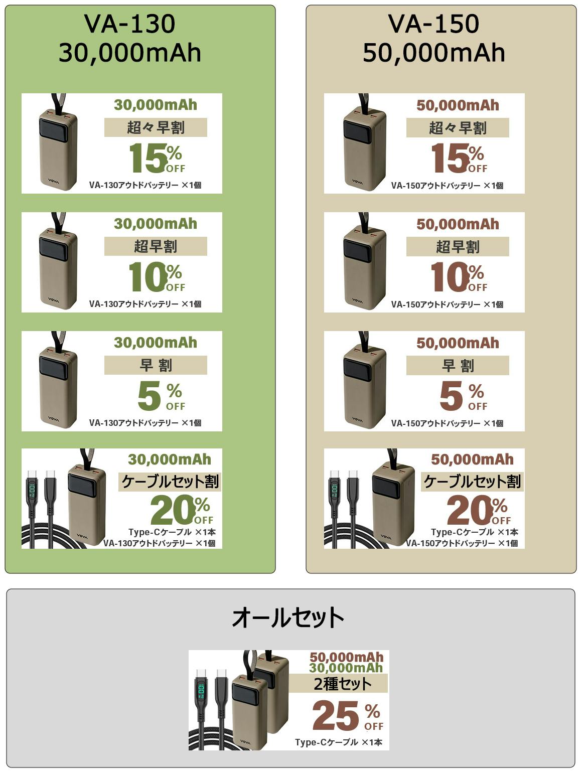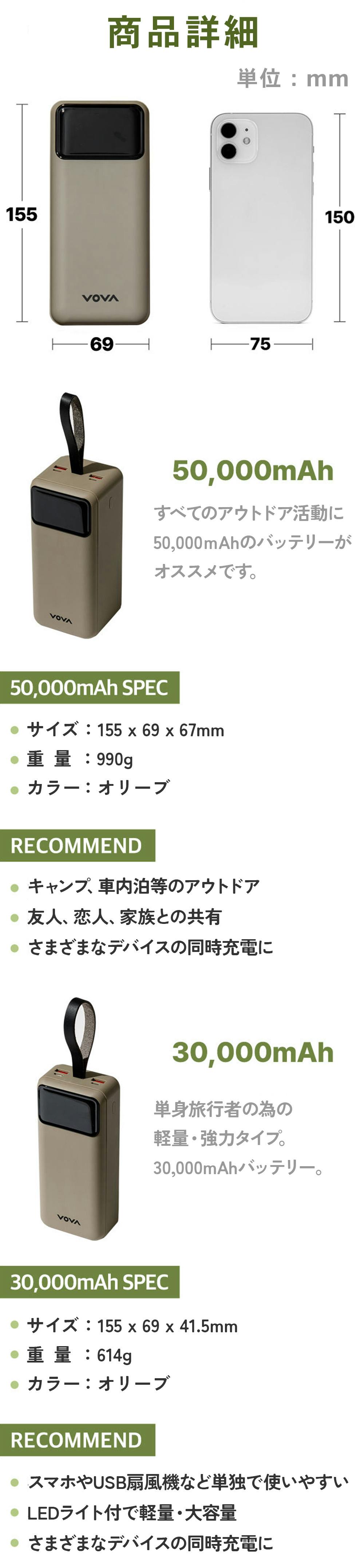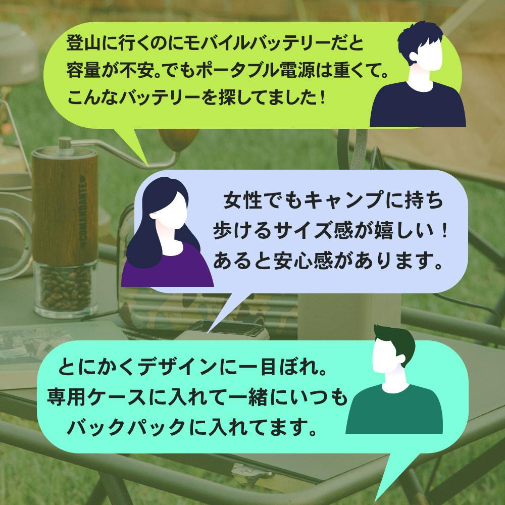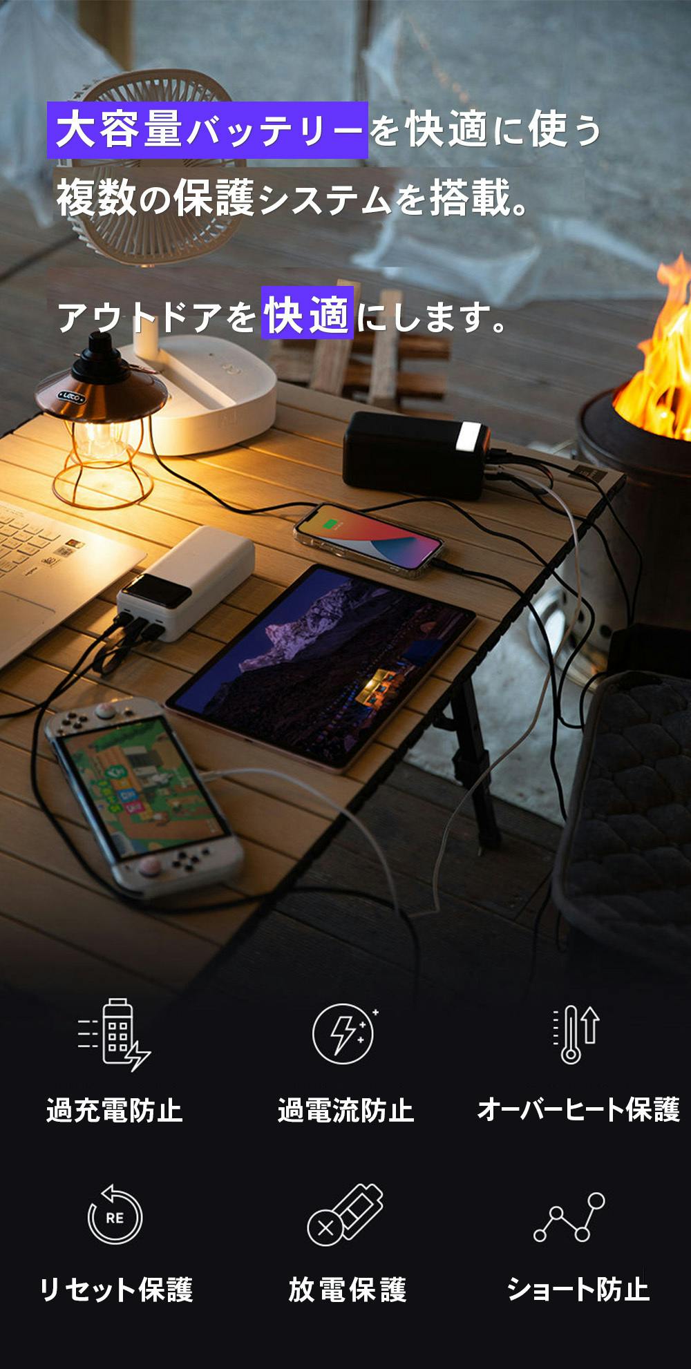 ポータブル電源よりも小さく、モバイルバッテリーよりも大きい大容量アウトドアバッテリー。丁度いいサイズの大容量50000/30000mAhバッテリーキャンプなどのアウトドアをはじめ、何かと充電が多い機器に対してご家庭でも便利なUSB出力バッテリーです。災害時の備えにも最適です。