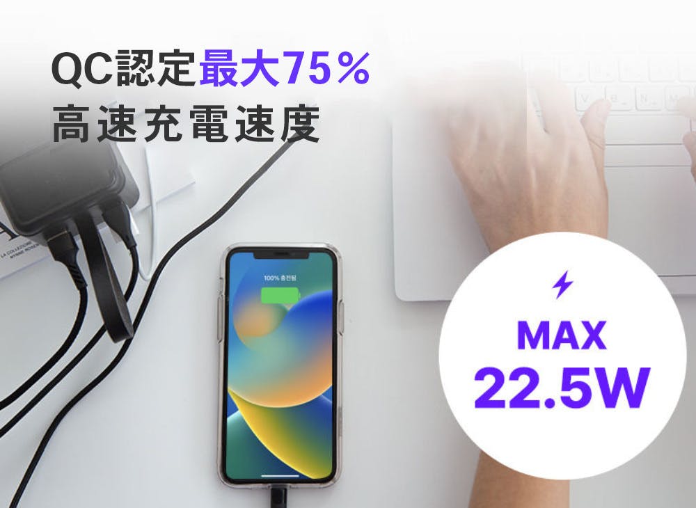 当社従来品の20Wをしのぐ22.5Wに対応。高出力、高速充電に対応します。