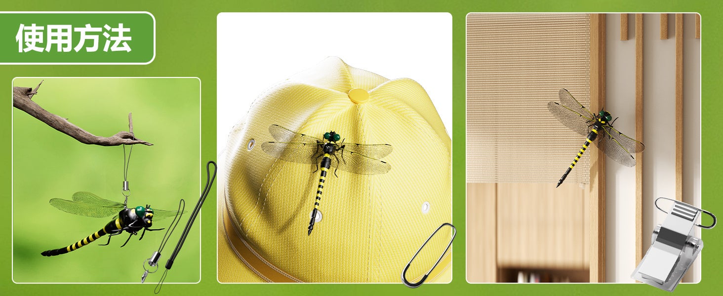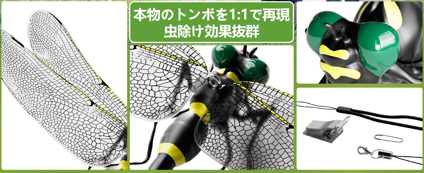 Aeemrnの虫除けトンボ君は、リアルなデザインと安全な素材を使用した環境に優しい虫除けアイテムです。様々なアウトドアシーンでの使用に最適で、安心してご利用いただけます。