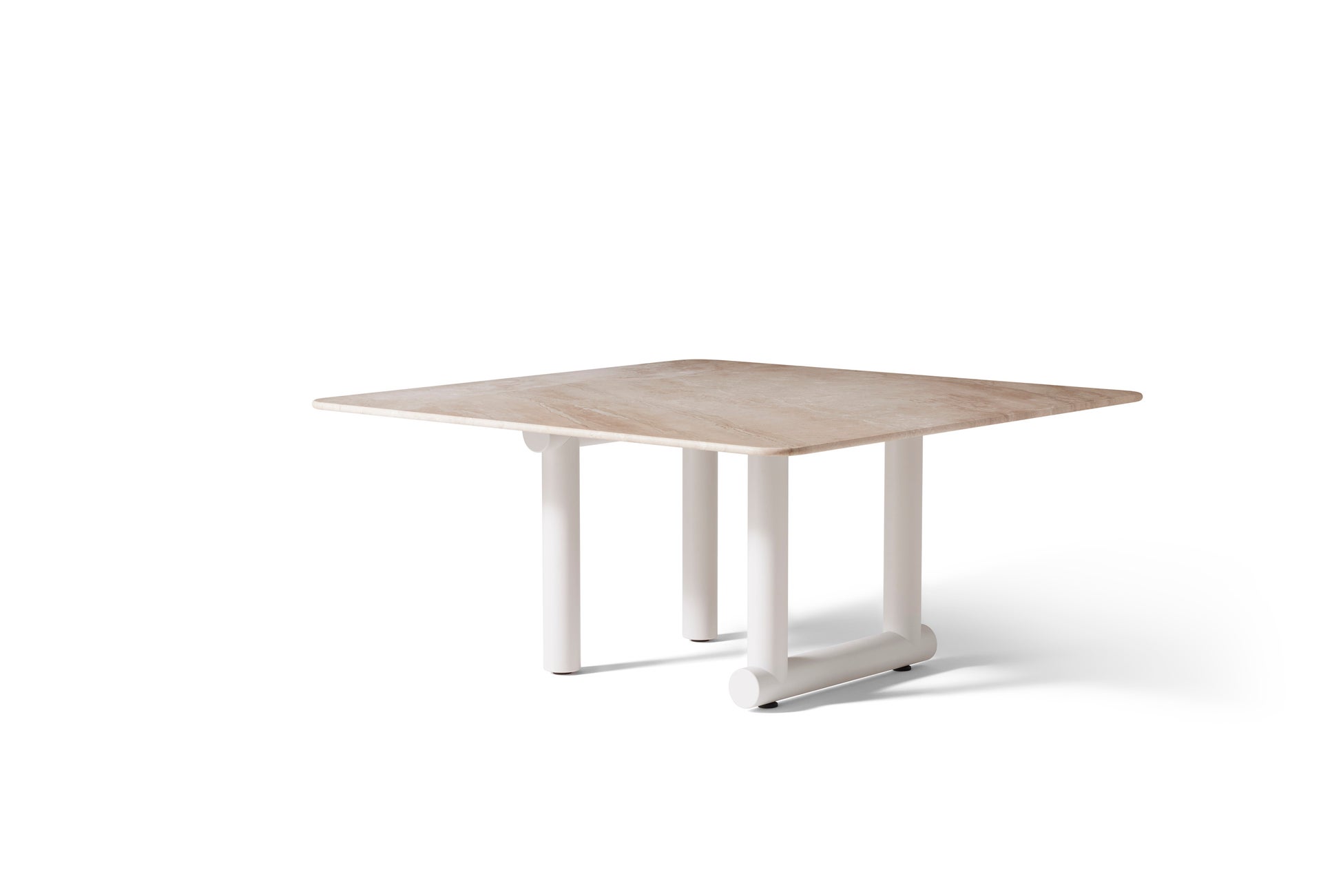 会話やおもてなしの舞台となるTRAMPOLINE table(トランポリン・テーブル)は、モダンな建築美が特徴です。アイボリー、トープ、テラコッタ、グリーンの4色展開で、塗装を施したアルミニウム製のベースは石造りの門を連想させます。幾何学的なエレメントが組み合わさり、際立った視覚効果を生み出しています。