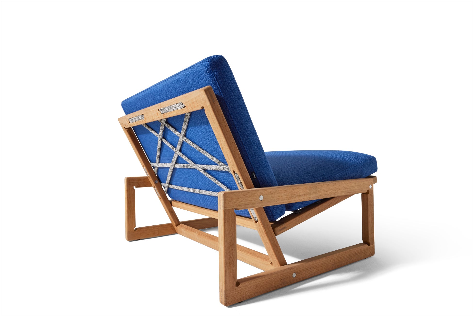 LIE OUT(ライ・アウト)の特徴の一つは、屋外での使用に特化した高品質の素材です。チーク無垢材のスラットで縁取られたベースに、ゆったりとしたサイズのマットレス。マットレスは、コレクションのモチーフであるグレーのグログランパイピングや、ベースに固定する同色のフロッグボタンの留め具など、エレガントなディテールにこだわりが詰まっています。