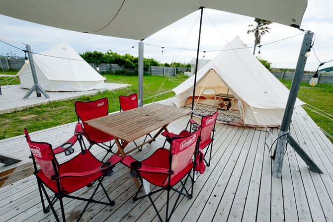 天井が高く、着替えやおむつ替えもラクラク。防水対策も万全なので、急な雨の日でも安心です。さらに、冷暖房付きの「プレミアムプラン」も用意されており、季節を問わず快適な滞在が可能です。
