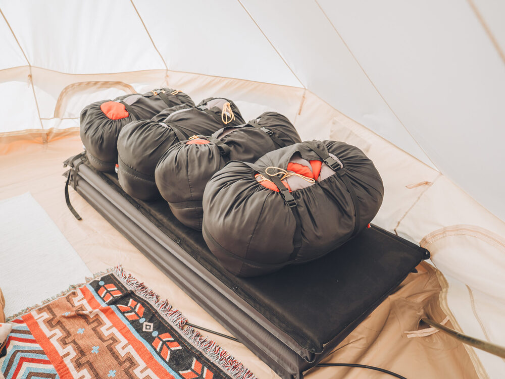 宿泊用テントは、床付きでくつろげる「ベルテント」と、開放的な「ツールームテント」の2種類から選べます。どちらもクッションマットが敷かれており、地面の冷えや硬さを感じにくく、快適な睡眠が叶います。
