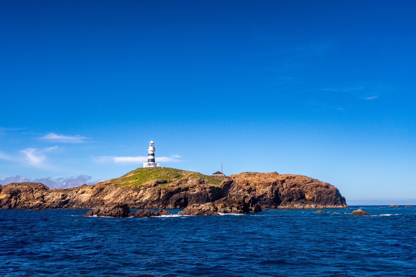 神子元島は伊豆半島の最南端、下田沖から約11km沖合に浮かぶ小さな無人島です。この島周辺の海域は、世界最大級と言われる潮流「黒潮」の恵みが交わる特別な場所として知られています。水深40メートルを超えるドロップオフもあり、複雑な海底地形が多様な海洋生物のすみかとなっています。