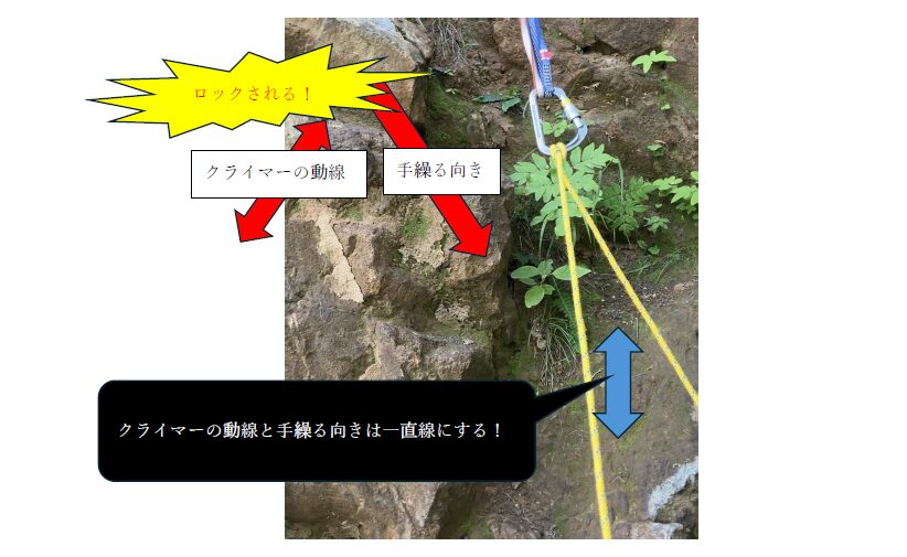 後の検証で、ムンターヒッチはビレイと後続クライマーが登る向きが屈曲していると上手くロープを流せなくなることがわかりました。そして、ノット※9 を反転させないとロープを流せません。