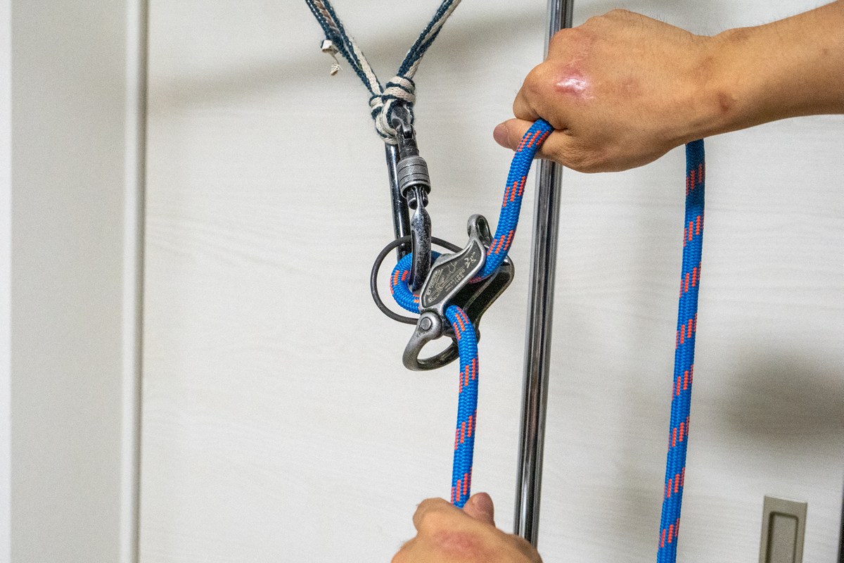 すぐにロープを流せるエイト環を使うか、写真のようなチューブ型のビレイデバイスの場合、「ボディビレイ※4 モード」の形で確保するとより安全です。簡易ビレイなら肩がらみや腰がらみも、後続クライマーを引っ張り上げながら必要に応じてロープをすぐに流せるので、状況に応じた方法で確保しましょう。