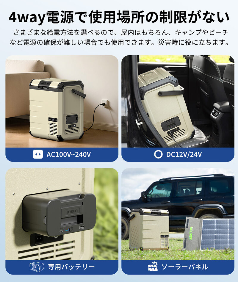 EENOURは、「アウトドアの時間を快適に過ごせる高品質な製品を世の中のお客様に提供する」ことを理念に、実用性と信頼性を兼ね備えた製品を展開。冷蔵庫やポータブル電源、ソーラー関連商品など、キャンプや防災にも役立つラインアップを揃えています。