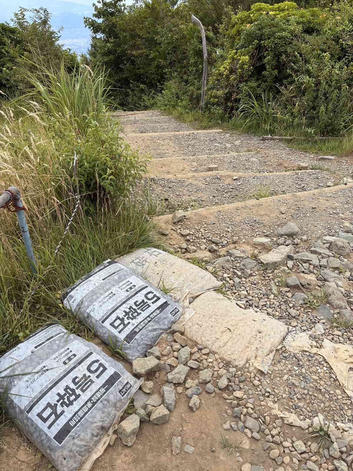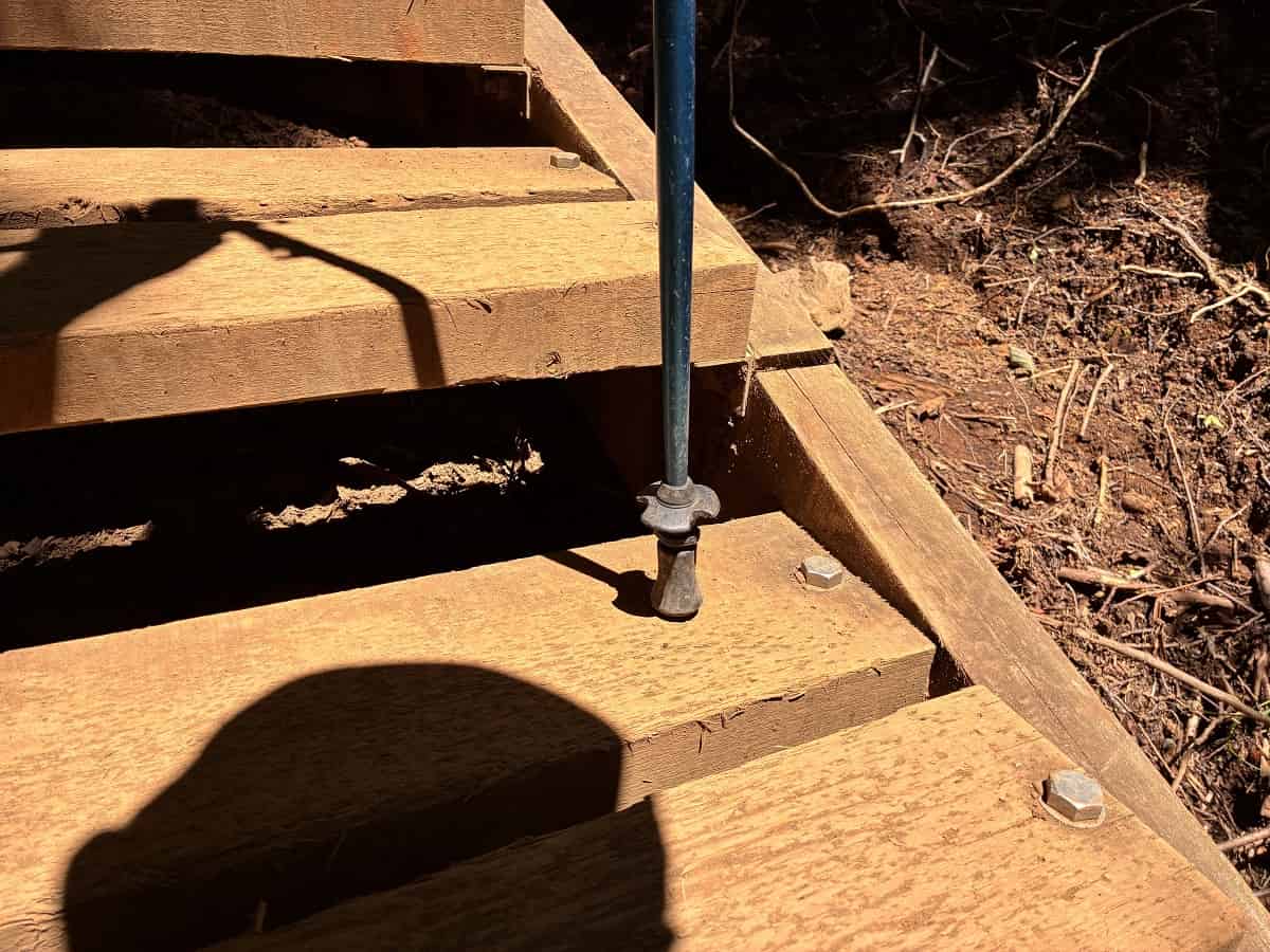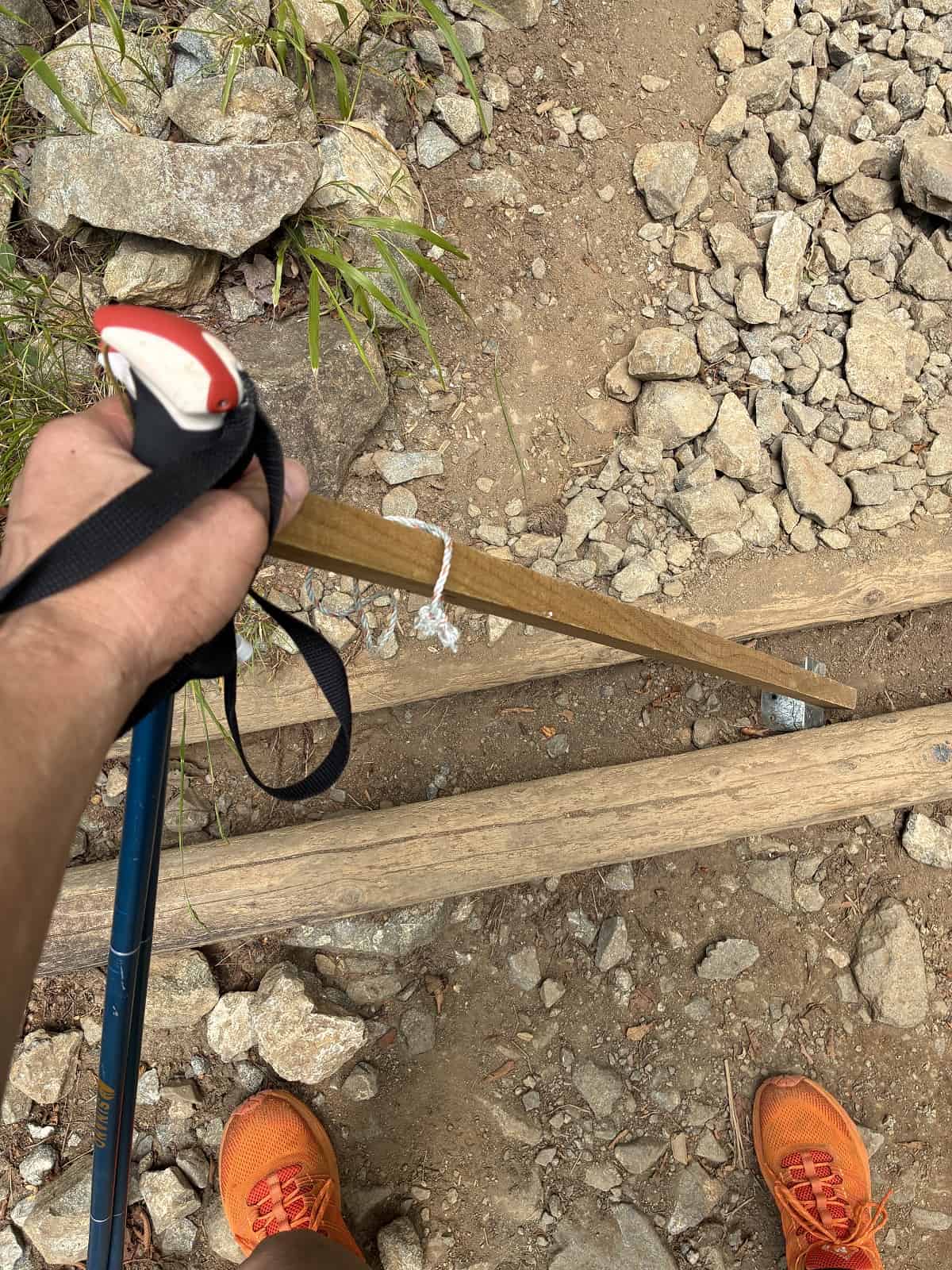 登山道に対して、2本の木材が水平に埋め込まれているところを見かけたことはありませんか?これは水切りといって、雨水を排出する構造です。