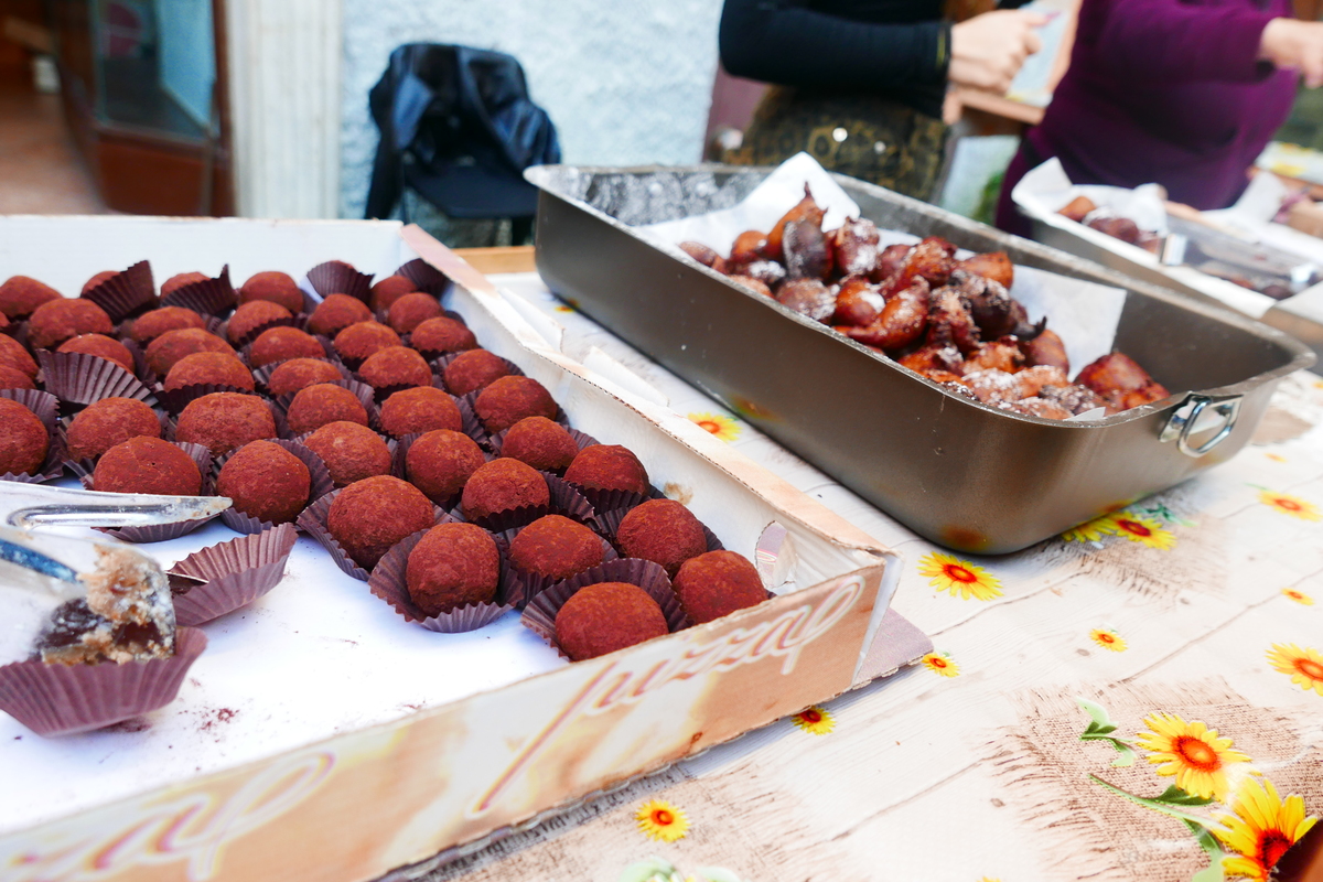 手前は栗入りのチョコ、奥に見えるのはフリテッレ
