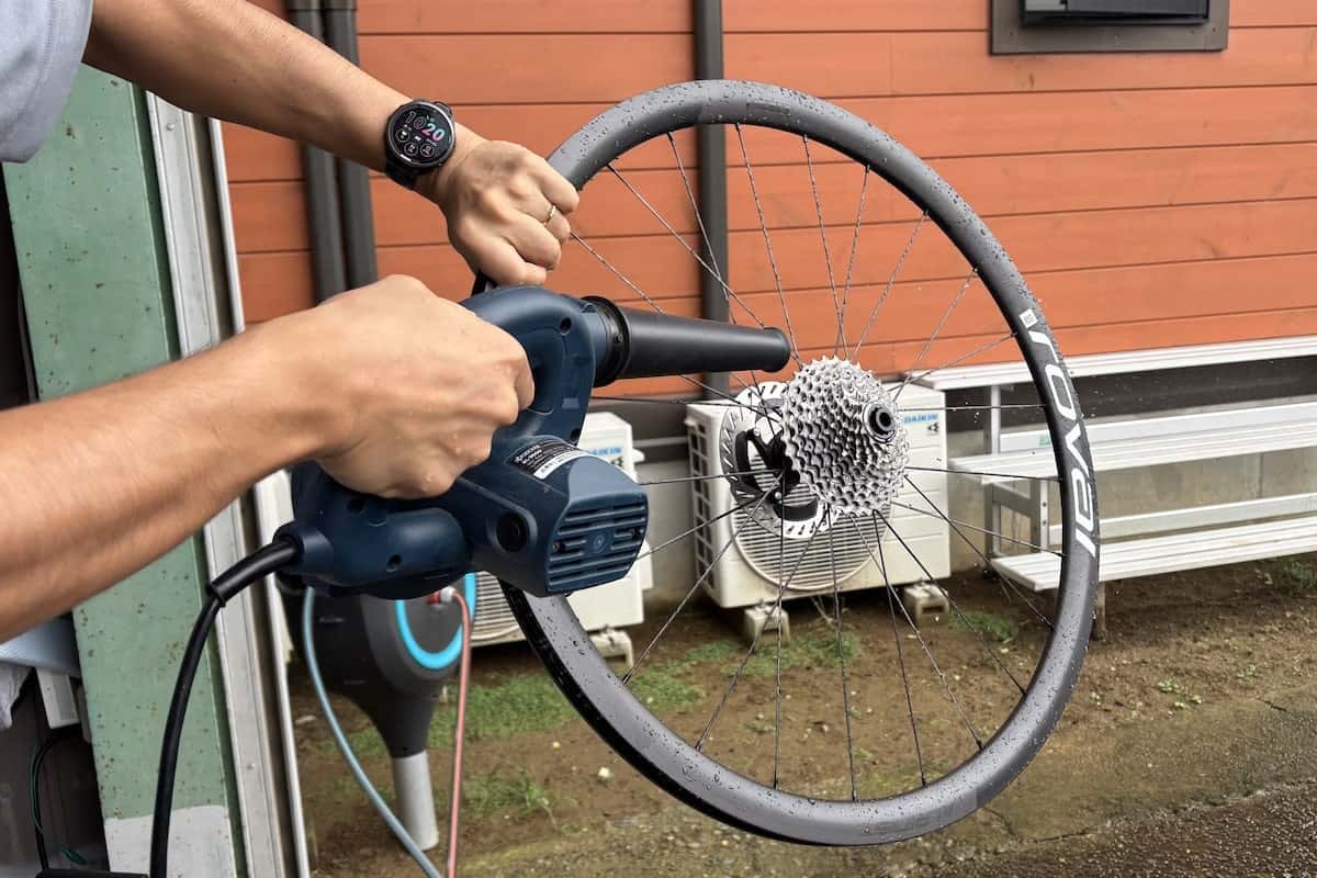 筆者はエアブローを使用して水分を飛ばし、室内で保管しています。エアブローを使用する場合は、風圧が強すぎてビードに負荷がかからないように離れた位置からやさしく風を当てるのがポイントです。