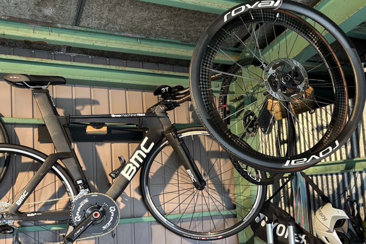 床に直接置くと湿気を吸いやすいので、新聞紙や段ボールを敷くか、ラックを使用して浮かせるのが理想的です。筆者は普段使いのものはホイールにつけたままラックを使用、長期間使用せずに外しておく場合はぶら下げて保管しています。