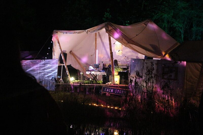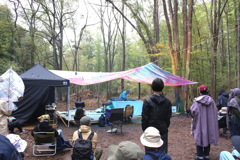 EACH STORYはこれまで5回開催のうち、4回が雨。土砂降りではないものの、今回も2日間、雨が降ったり止んだりを繰り返す空模様。野外イベントなので晴れに越したことはありませんが、アンビエントミュージックはもともと、川のせせらぎや波・風の音、鳥や虫の鳴き声といった自然音を録音(フィールドレコーディング)し、音源の素材として使うことが多いジャンル。ライブ中の雨の音や景色が、とても似合うのです。