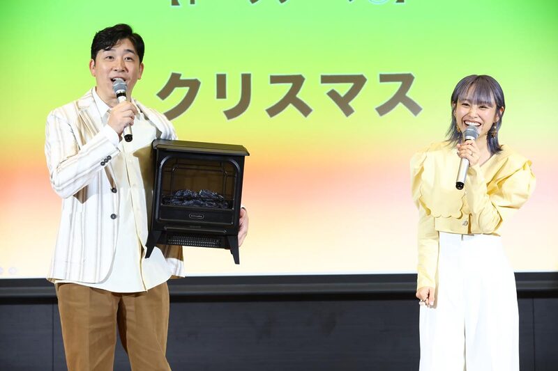 トーク中盤には、高橋さんからのクリスマスサプライズもありました。贈られたのは、青森であべさんが営む温泉施設で使えるようにと、暖炉型の電気ヒーターです。