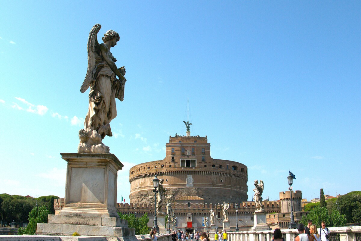 もともとは古代ローマの五賢帝(ごけんてい)※1の一人、ハドリアヌスによって建てられた霊廟(死者を祀る建物や場所)である「カステル・サンタンジェロ城」(奥)と手前のはバロック時代に建設された「サンタンジェロ橋」(手前)