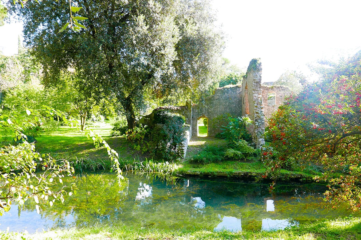 中世都市の遺構を利用して庭園にした「ジャルディーノ・ディ・ニンファ」