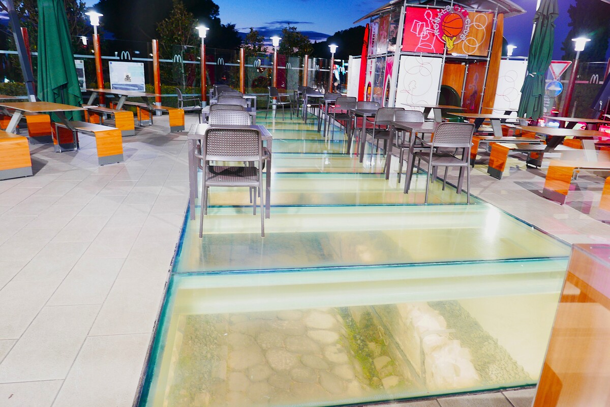 掘り起こすと遺跡が出てきてしまうのは、ローマの町だけではありません。ローマ近郊のマリーノの町では、マクドナルドの店舗を建設中に地下からアッピア街道の一部が出現。行政とマクドナルドが話し合った結果、マクドナルドに来店するお客さんが遺跡を見学できる構造にしました。