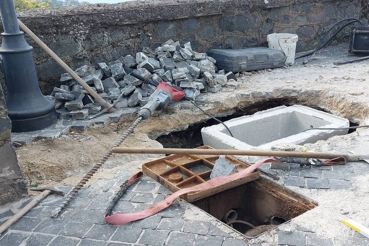 近所で行われていた水道管の工事。石畳の石はすべて再利用されます