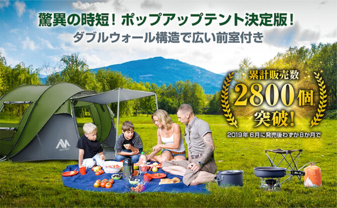 ayamayaポップアップテントはキャンプ大国アメリカで販売開始後わずか8ヶ月で販売数2,800個を突破しました。